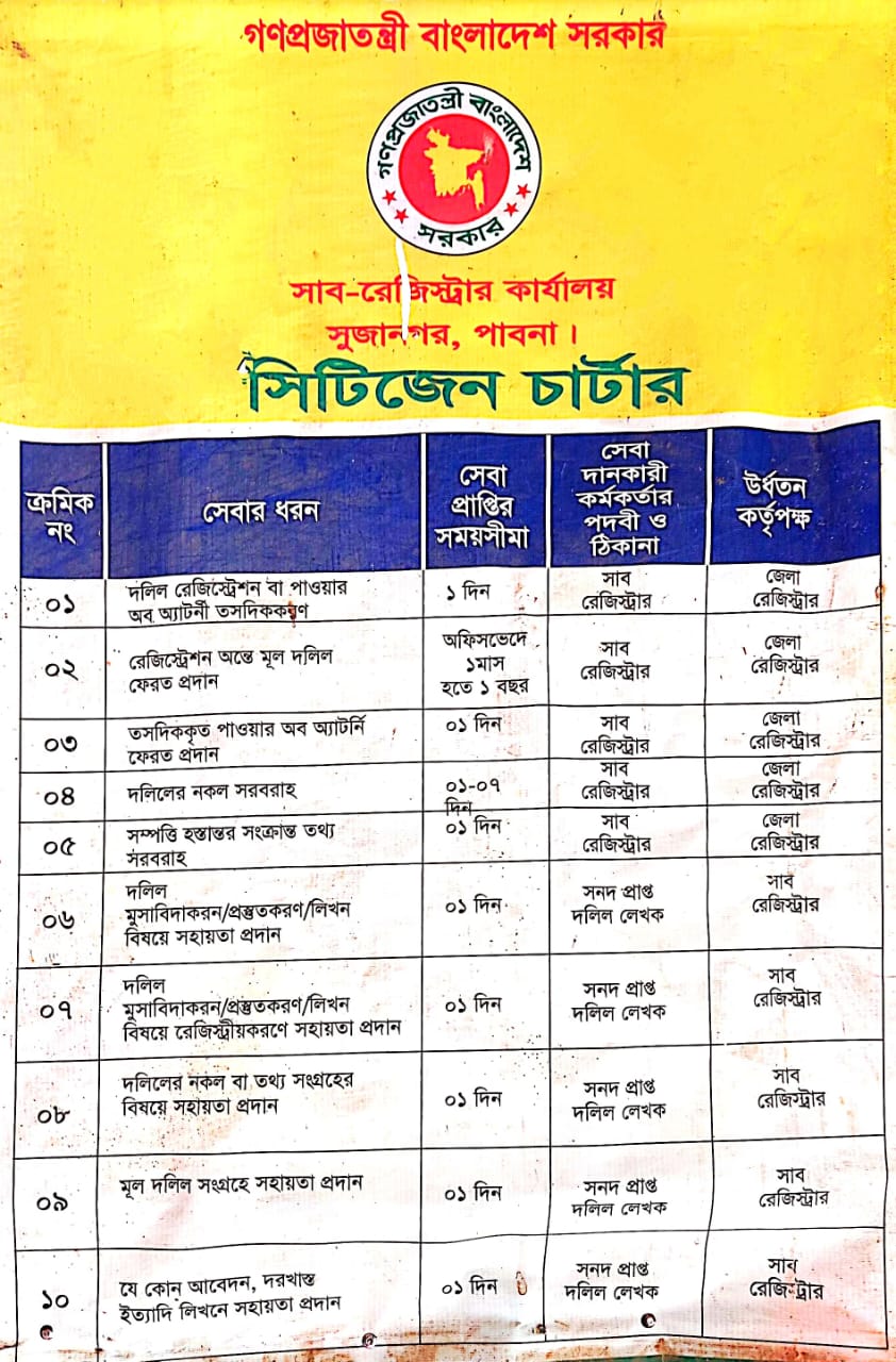 | ০৭ | দলিল মুসাবিদক করণ প্রস্ত্তুত করণ, লিয়ন বিষয়ক সহায়তা গ্রহণ | ০১ দিন | সম্পদ প্রাপ্ত দলিল লেখক | সাব-রেজিষ্ট্রার, সুজানগর, পাবনা। |